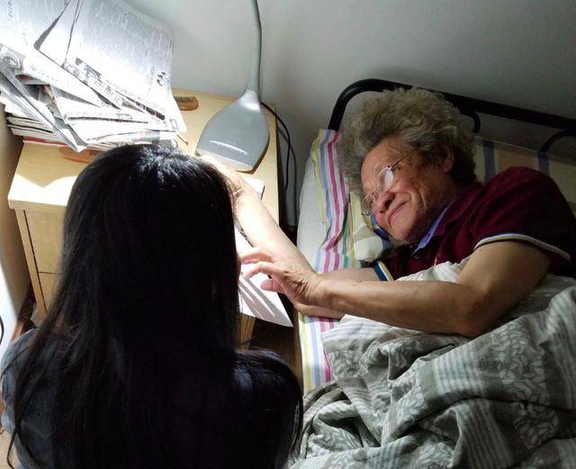另一张杨教授躺在床上,戴着眼镜亲切地抚摸着小女孩。从居住的环境看,杨教授的生活并不是大家想象的豪华,反而还不如普通家庭的感觉,装修简单,空间也很狭小,一点没有奢靡的感觉。