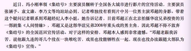 這還不是最糟的,歷經千辛萬苦,《集結號》拍完了,到了要宣發的時候,作為男贰號的鄧超又不見了!