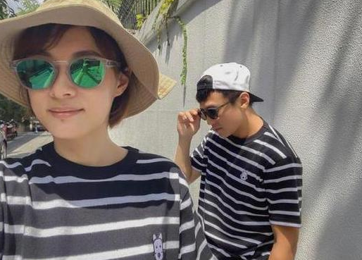 照片中,鄧超和孫儷都穿著黑色白條紋短袖,壹看就知道是情侶裝了。