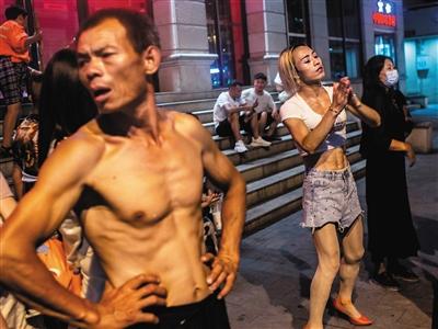 8月12日,當地網紅在萬盛街直播跳舞,圍觀群眾也隨之舞動。壹位網紅說,“之前都做過群演,疫情期間接戲反而不如直播掙錢”。