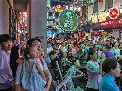 8月11日,游客在橫店影視基地圍觀演員表演。據工作人員介紹,7月份,橫店影視景區的游客訪問量突增,特別是帶著孩子的家長。