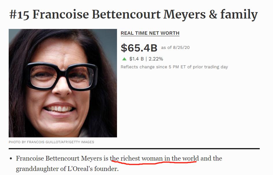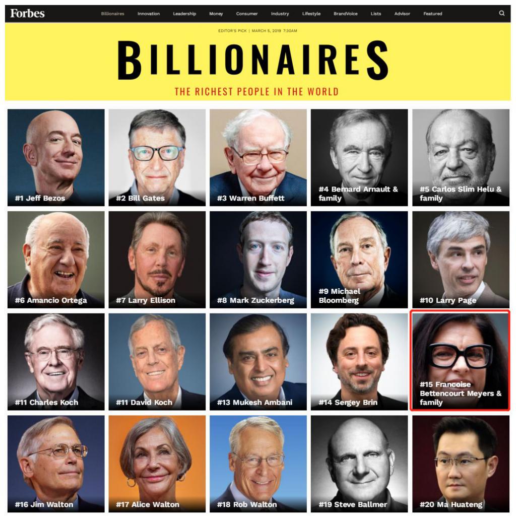 歐萊雅集團(L'Oreal)創始人唯壹的孫女,67 歲的弗朗索瓦斯 · 貝當古 · 邁耶斯(Fran?oise Bettencourt Meyers),便是憑借著高超的投胎技術,2017 年在母親去世後繼承財產後,繼續蟬聯全球女首富,福布斯統計最新身家是 654 億美元。