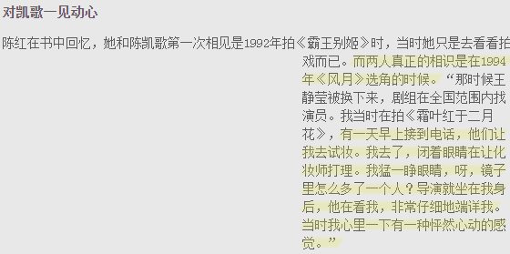 早在大學時期,陳紅就因為《黃土地》對導演陳凱歌暗懷敬意,隨後在94年,《風月》片場中又因為對方的仔細端詳而怦然心動。