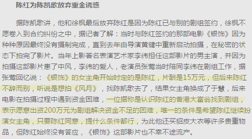 可當時發生了壹起黑函事件,制片人徐楓突然收到壹封匿名信,直指陳紅為了拍《風月》與陳凱歌“如何如何”,陳紅因此連丟了《風月》、《銀飾》兩部戲。