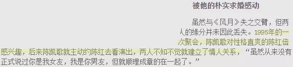 同樣也是在1994,陳凱歌因《風月》與陳紅結識,用他的話說就是“金風玉露壹相逢,便勝卻人間無數。”