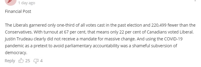 @ 自由黨在上次選舉中只獲得了叁分之壹的選票,比保守黨少了220499。 投票率為67%,這意味著只有22%的加拿大人投票支持自由黨。Justin Trudeau顯然沒有獲得進行大規模變革的授權。 用COVID-19大流行作為借口避免議會問責制是對民主的可恥顛覆。