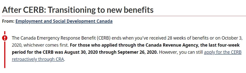 聯邦政府表示, 雖然許多加拿大人已經能夠安全返回工作,但仍然有許多加拿大人由於目前的公共衛生危機而找不到工作或就業不足。今年秋天,隨著政府從 CERB 過渡到靈活且更容易獲得的就業保險 (EI) 計劃,政府還繼續支持不符合 EI 條件需要的工人,並提供新的支持,使加拿大人在生病時能夠留在家中。