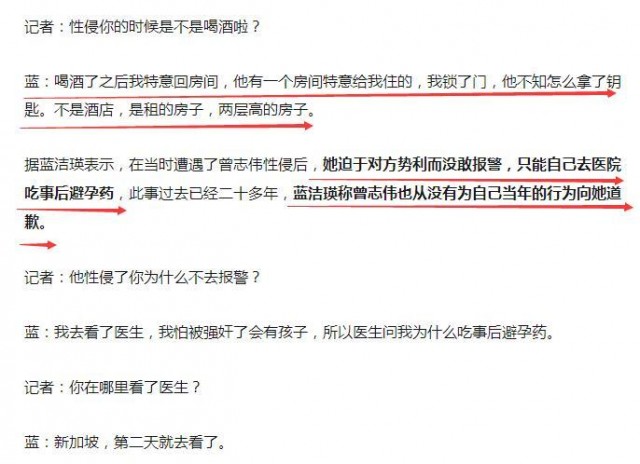 表示當年她去新加坡探班時,曾志偉借酒醉偷入她的房間對她施暴,她懾於對方的地位不敢報警,而是第贰天在新加坡去看醫生並服用事後避孕藥。