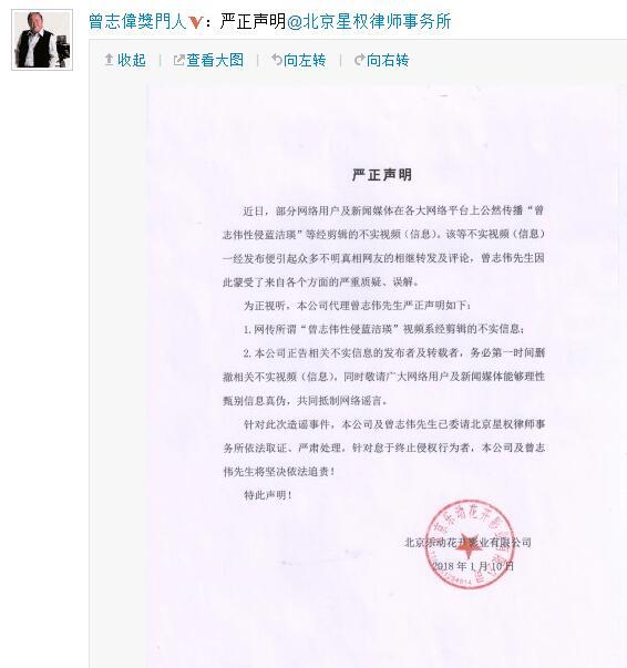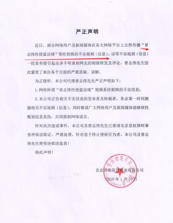 但後來曾志偉方則發聲明表示“曾志偉性侵藍潔瑛”是不實視頻。