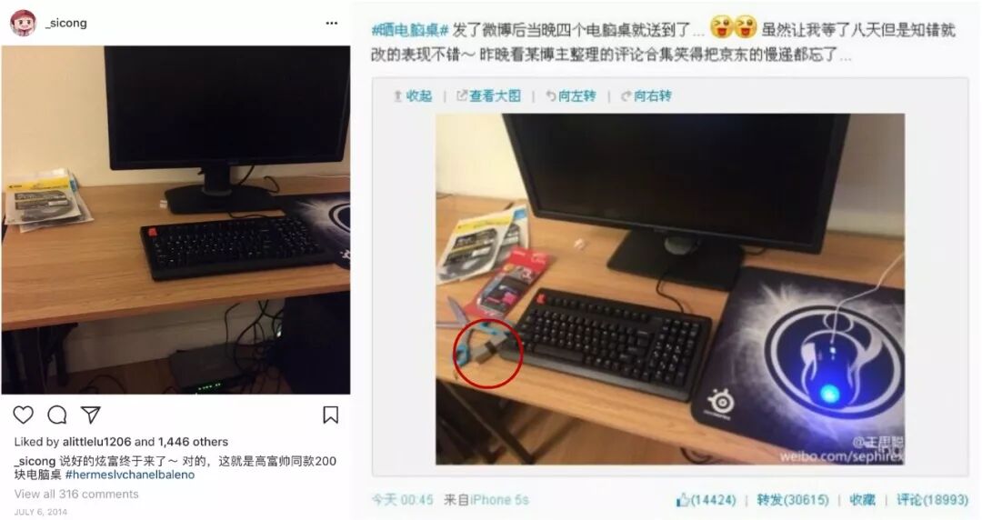 ▲ 他用著200塊的電腦桌,卻被發現桌上的u盤(右圖紅圈處)至少在當時售價過萬。