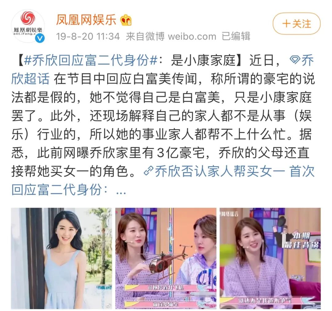 ▲?這些裡面集大成者便是喬欣了,早年靠上節目的別墅視頻正炒反炒都炒了壹遍,又是自己家又是樣板間又是鄰居現身說法又是網友爆料,甭管真相如何,熱度是賺到了,白富美形象深入人心。
