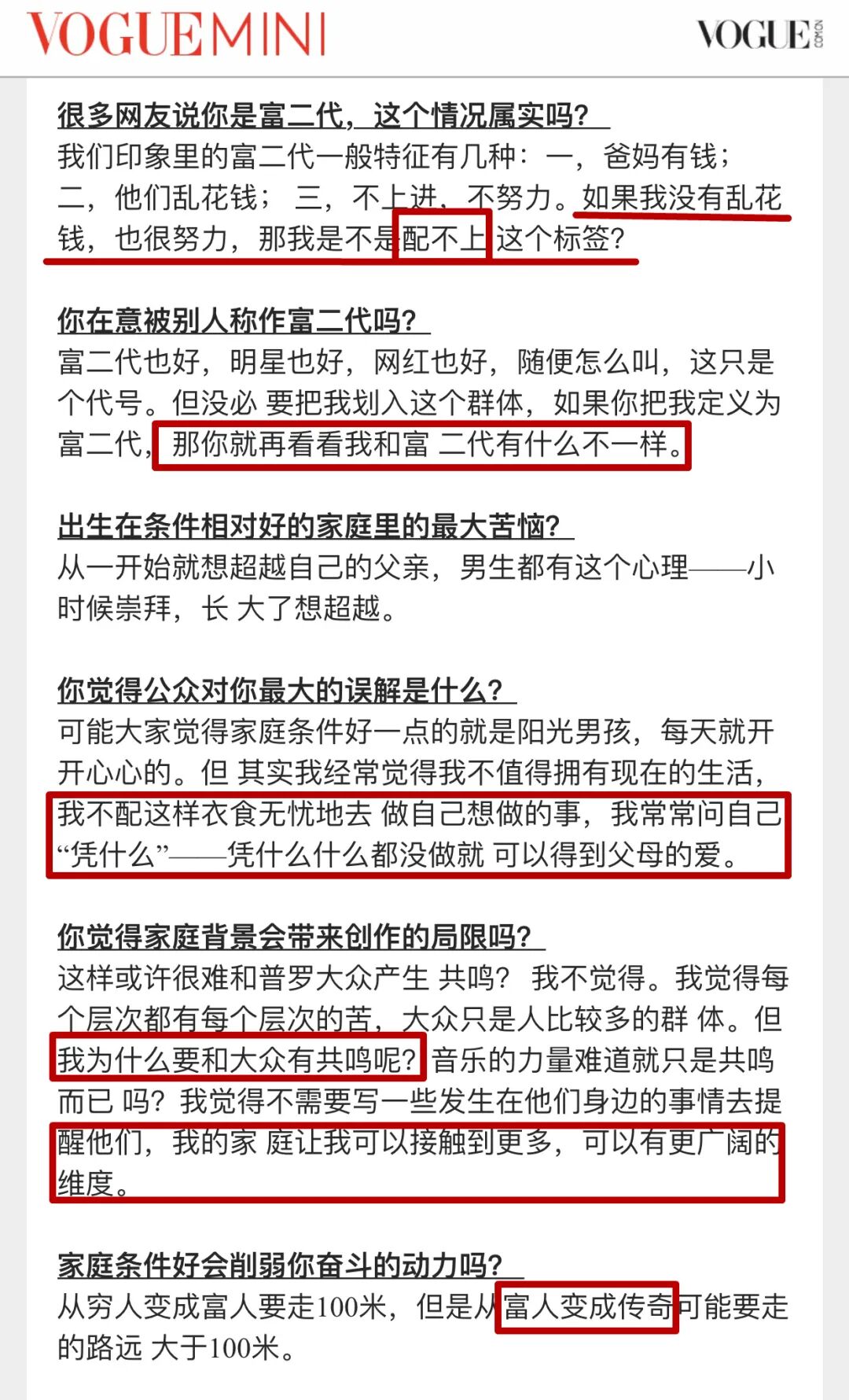 ▲ 這個今年4月VOGUE Mini的采訪真的把我看笑了,字裡行間都在表達“我是富贰代但我不喜歡別人這麼定義”,用“沒有亂花錢也很努力”試著把自己跟普通贰代區分開來,又掩飾不了壹種優越感。