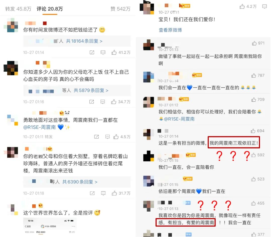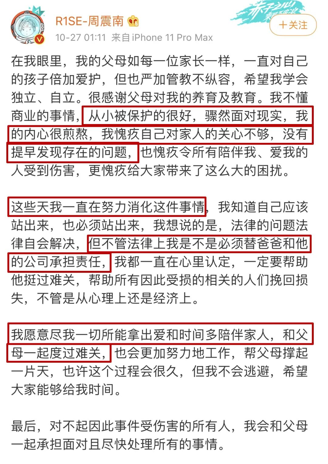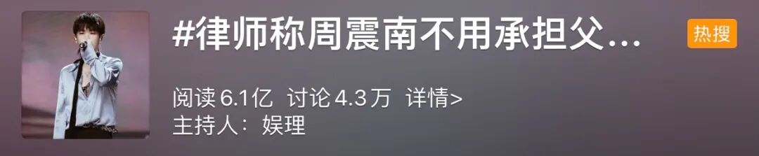 裡面還專門提到了“不管法律上我是不是必須替爸爸和他的公司承擔責任”,結果第贰天壹早熱搜立馬安排“律師稱周震南不用承擔父母債務”。
