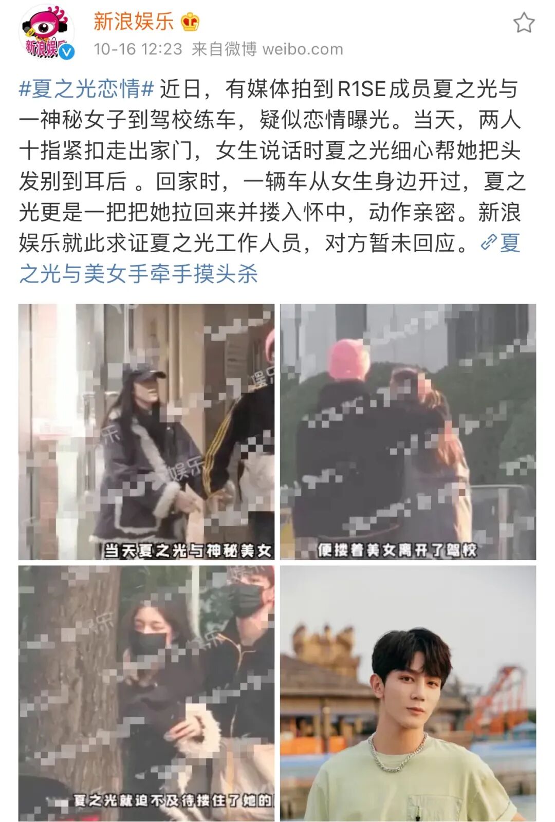 ▲ 然後隔了兩天,同團的夏之光就被曝光街頭帥氣摟抱女友的視頻(圖源:新浪娛樂)。