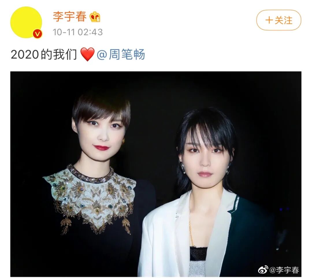 ▲?10月,李宇春周筆暢的這條合照微博也算是“活久見”了,到此時兩人才互相關注了彼此微博。