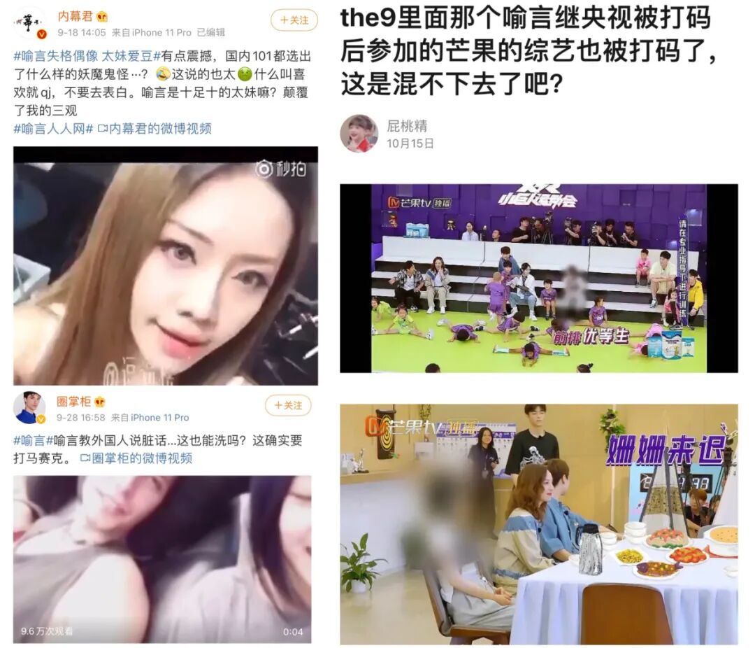 ▲ 比如今年5月底才通過《青春有你2》成團的THE9成員喻言,早年大膽言論遭到公開後直接被央視和芒果綜藝節目打碼。