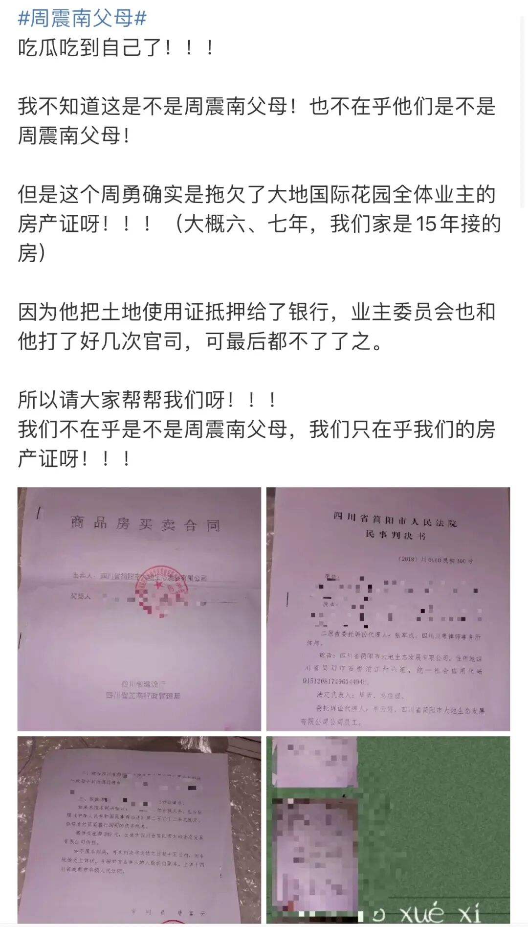 ▲ 注意這裡的點不僅是父母同時背負多起涉訴案件有能力履行卻拒不履行,更嚴重的是,他們名下開發的樓盤早已經交付(2015年10月)業主卻遲遲拿不到產權證,多起投訴上達市委辦公室,得到的回復是因為樓盤存在多項問題、土地抵押被法院查封限制。明明是開發商的錯誤,最後買單的卻是無辜的業主們(圖源:豆瓣自由吃瓜基地)。