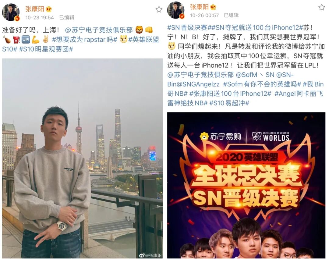 ▲ 開通微博那天直接買了開屏廣告,實在是財大氣粗。左圖他穿的是FEAR OF GOD x Ermenegildo Zegna毛衣,也就6000+人民幣吧,手上戴的是AP皇家橡樹系列白陶瓷萬年歷,大概120萬+人民幣;右圖直接抽獎開送100台iPhone12。