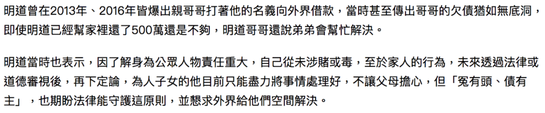 既然“家人是最後的底線”,家人的債務自然也該壹並承擔了。在采訪裡說要感恩父母,不能到此時此刻來甩鍋撇清關系吧。