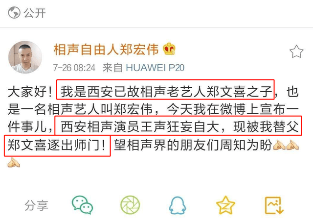 郑宏伟的这条“清理门户”没发出多久,就引来了网友们的炮轰。王声一没有做背叛师门的事情,二没有侮辱先师,三来郑宏伟是郑文喜老先生的儿子,并不是大徒弟,所以他并没有将其他弟子逐出师门的立场,最终只好删除微博,当作无事发生。