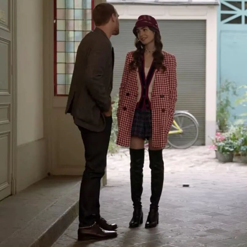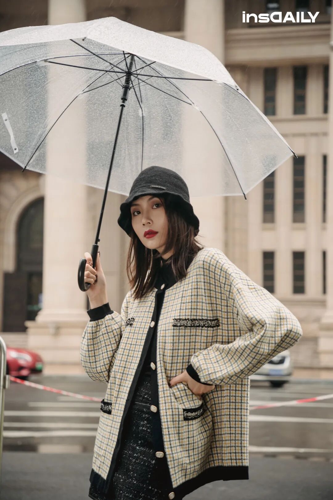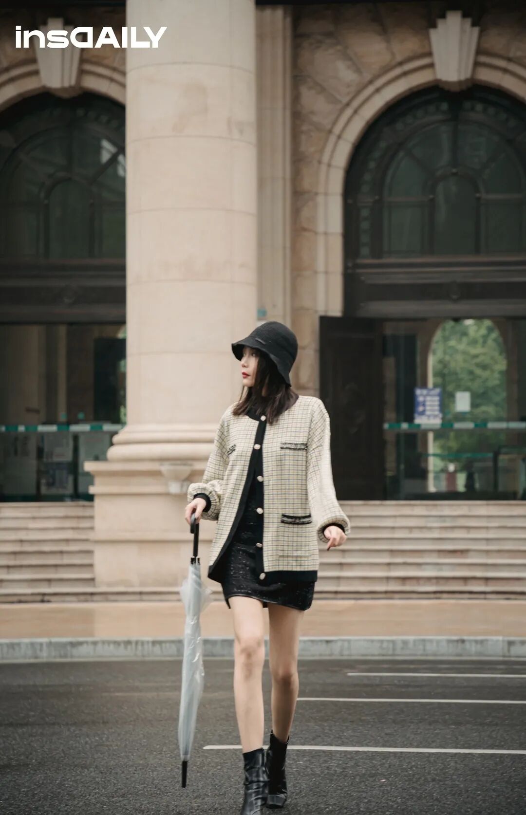 可樂換成了素淨又優雅的的卡其格紋外套,完全不挑膚色,加上略微宮廷袖的設計,訴說著滿滿的法式風情。