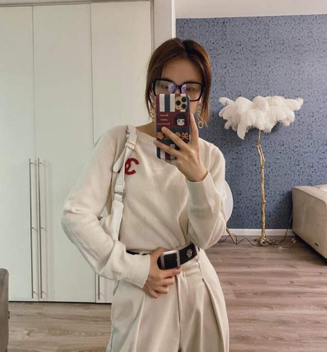 昕姐壹身米色系Look,幹淨清爽,身穿壹襲毛衣和闊腿褲,溫婉又優雅,彰顯知性女性,黑色腰帶增添利落,也讓整個造型更富有層次感,黑框眼鏡是點睛之筆,很有書生氣,時尚度up。