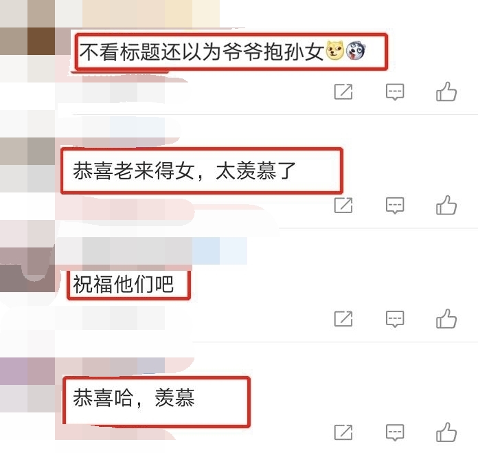這份濃濃的父女情誼,也令網友們不禁動容紛紛送來祝福。原本有所爭議、被大家驚歎的這段相差30歲的“忘年戀”,也因為這充滿幸福的日常,讓大家不斷稱羨。當然也有逗趣網友調侃“不看標題還以為是爺爺抱孫女。”