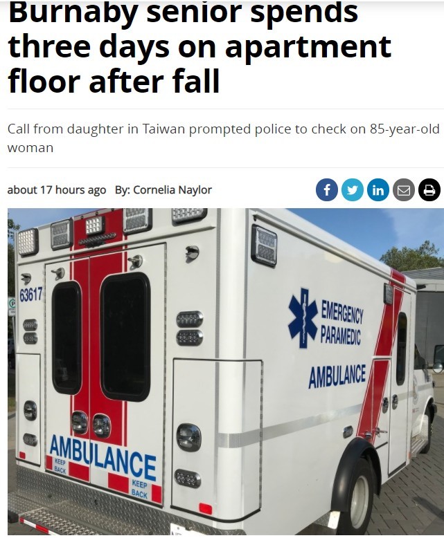 老年人獨居要注意,據媒體報道,最近大溫壹名華裔老婦在家中摔倒,整整在地上躺了3天,幸好聯系不上母親的女兒從台灣打電話求救,這名老婦才獲救,否則後果真的不堪設想。