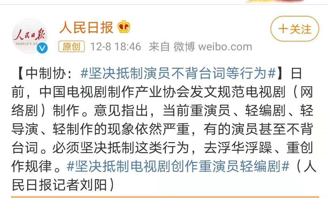 不過最近中制協終於發話,在發文中提到,當前影視劇重演員,輕編劇,輕導演,輕制作的現象依然嚴重,有的演員甚至不備台詞。必須堅持抵制這種行為,去浮華浮躁,重創作規律。