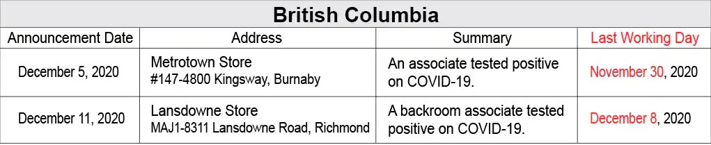 最近列治文暴露病毒的学校有: Thomas Kidd elementary (11月30号, 12月1和 3号); McRoberts secondary (12月.1 到 2号 和12月4号 ); William Bridge elementary (11月30号); Maple Lane elementary (11月.20, 24 至 25号和12月1号); Richmond Secondary (11月24 至 27号); Burnett secondary (11月24 至 26号); McNair secondary (11月19 号和11月24 至 27号); Hugh Boyd secondary (11月 25 至 26号和 11月30号.); 以及 Steveston-London secondary (11月24 至 25号)。