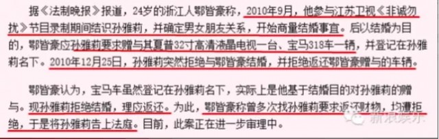 后来孙雅莉悔婚,但拒绝归还宝马,男嘉宾一纸讼状把孙雅莉告上法庭,最后她被判归还购车款近30万。