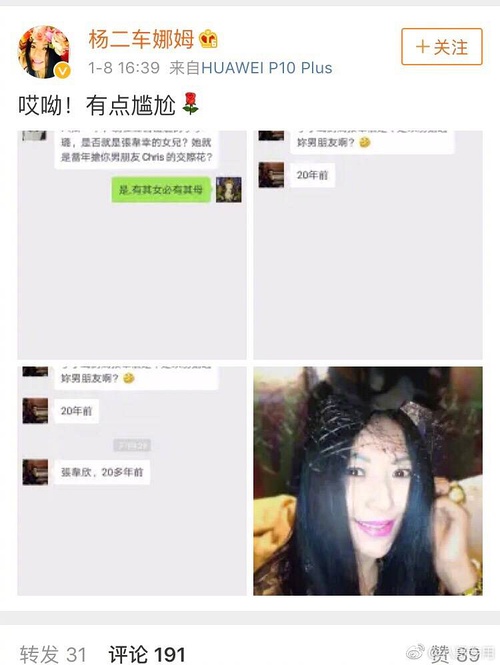 18年初李小璐丑聞曝光的時候,楊贰車娜姆在個人社交平台上發了幾張和舊友的聊天截圖,並配文稱“哎喲!有點兒尷尬”。