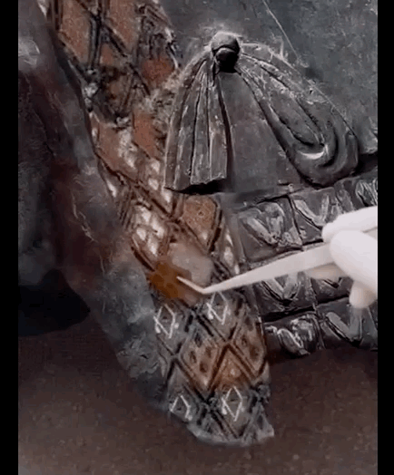 把剝落的紋飾貼在鎧甲身上。