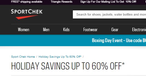 - Sport Chek ----結帳時使用促銷代碼BOXING20,全場均可享受20%off的折扣。有效期為12月24日至27日。