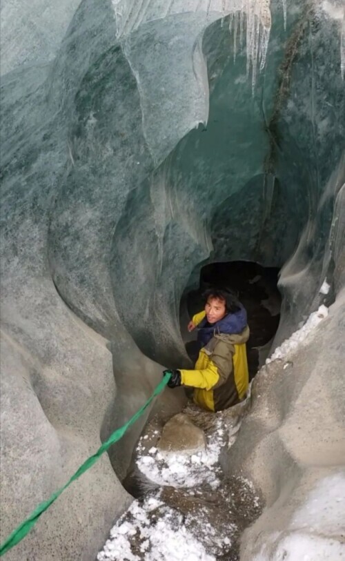 王相軍發布的視頻截圖,顯示他正在進入壹條冰川的內部
