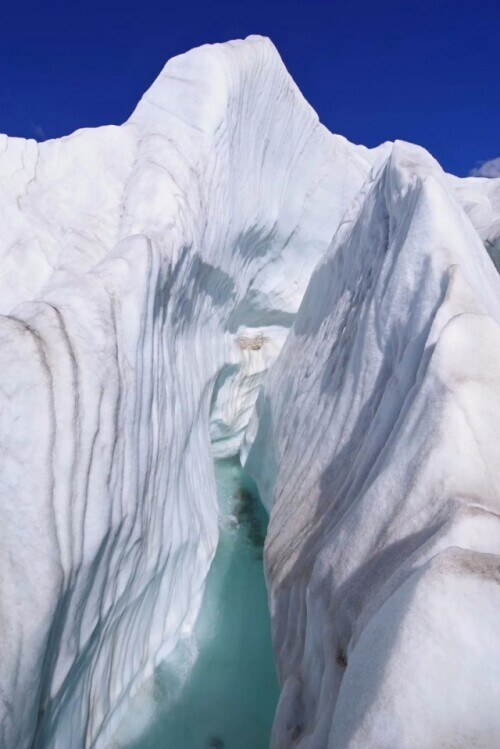 在王相軍眼中,冰川是壹個由各種顏色和形態組成的夢幻世界。他見過藍色和黑色的冰川:藍色的通常更古老,由於經過成百上千年的擠壓,冰體的透明度極高;黑色的則包含了石頭、沙子、泥土等雜質,是冰川攜帶的來自周圍山坡的松散堆積物。