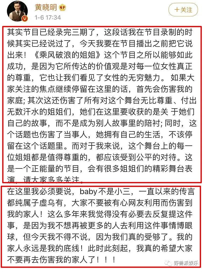 黃曉明的第壹段文字是回答他和李菲兒的八卦,教主用浪姐的女性正能量消化八卦,轉移公眾的關注點放在節目上,呼吁大家要有愛心,不要有好奇心,說到這裡自然也就沒有李菲兒什麼事了。