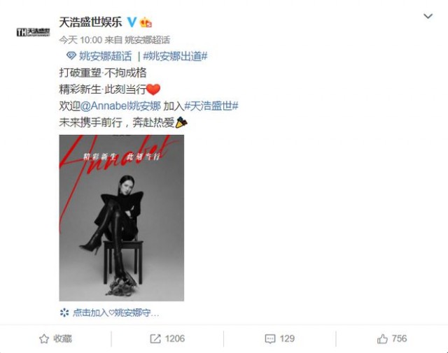 今日上午10點整,微博認證賬號“天浩盛世娛樂”宣布姚安娜出道,對姚安娜加入“天浩盛世”表示歡迎。