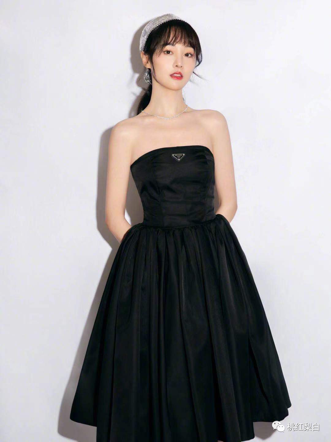 有仔細觀察就知道,最近兩年裡鄭爽穿Prada的次數真的很多,Prada這幾季主打的環保尼龍系列,也確實蠻適合鄭爽風格的,比如這個黑色尼龍抹胸小黑裙,就被她穿出了壹種矜奢大小姐的感覺。