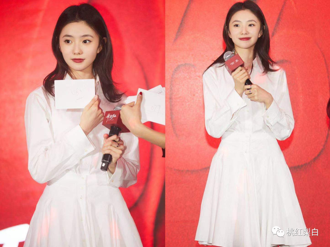 近期另壹身披發白色襯衫裙的look,也搭配得剛剛好,特別是這個略深壹些的楓葉紅唇色,真的別有壹番美感: