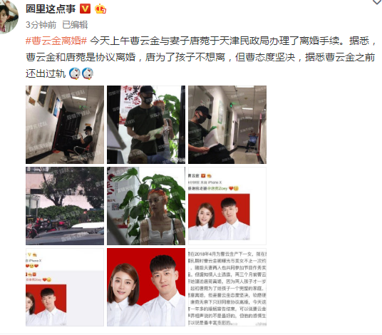 去年6月11日,有网友爆料,今天上午10点20分左右,曹云金和唐菀一同乘车从北京赶到了天津民政局办理离婚手续。