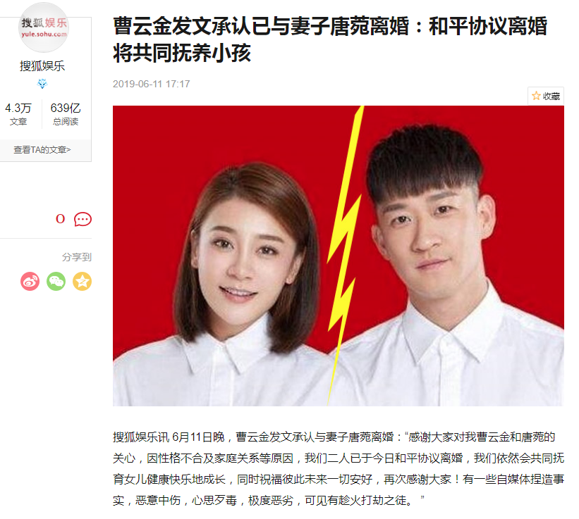 随后,曹云金曹云金发文承认已与妻子唐菀离婚:和平协议离婚 将共同抚养小孩,不过“有一些自媒体捏造事实,恶意中伤,心思歹毒,极度恶劣,可见有趁火打劫之徒。 ”的说法,是不是有点此地无银三百两的感觉呢……