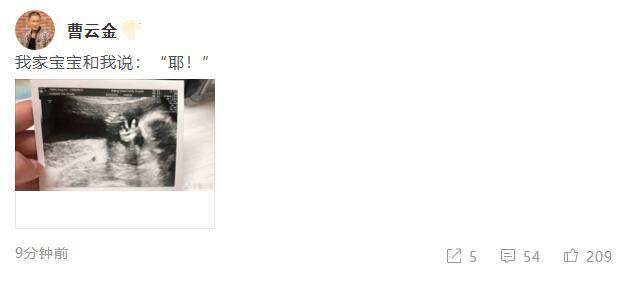 2018年4月13日,曹云金在微博晒出宝宝的B超照,并配文我家宝宝和我说:耶。