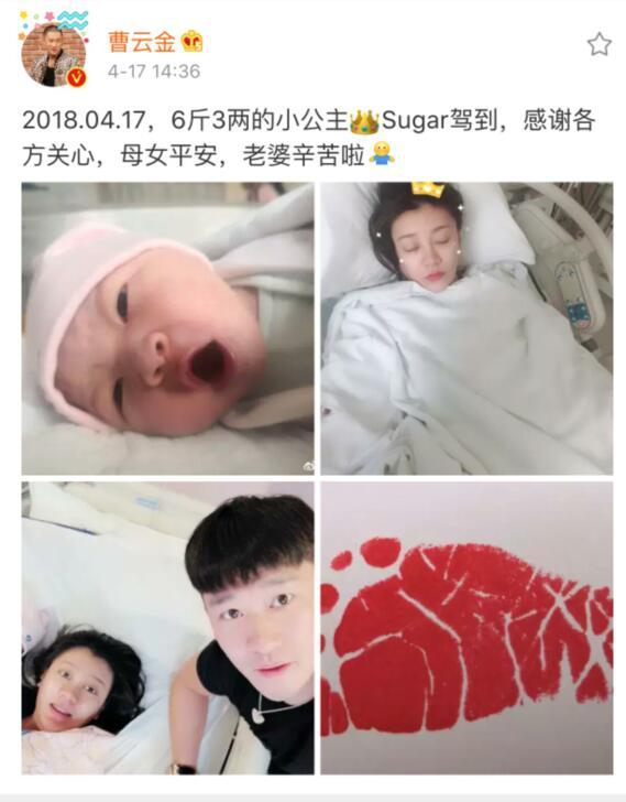 2018年4月17日下午,曹云金宣布唐菀产下一名女婴:2018.04.17,6斤3两的小公主。