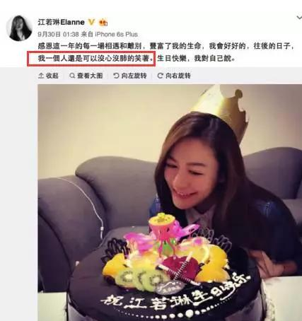 而9月30日,江若琳在微博上传自己庆祝生日的照片,发文称“我一个人还是可以没心没肺的笑着”,间接承认和曹云金分手。