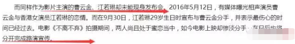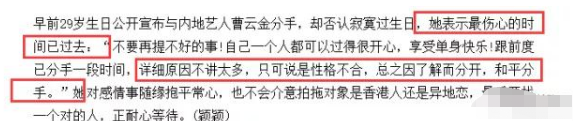 而至于分手的原因和感受,曹云金也未多提,仅江若琳表示不愿意多谈,称伤心的时间已经过去,而自己很享受单身的样子。对于没有和曹云金走到最后的原因,江若琳归结为是性格不合,因了解而分开,和平分手。