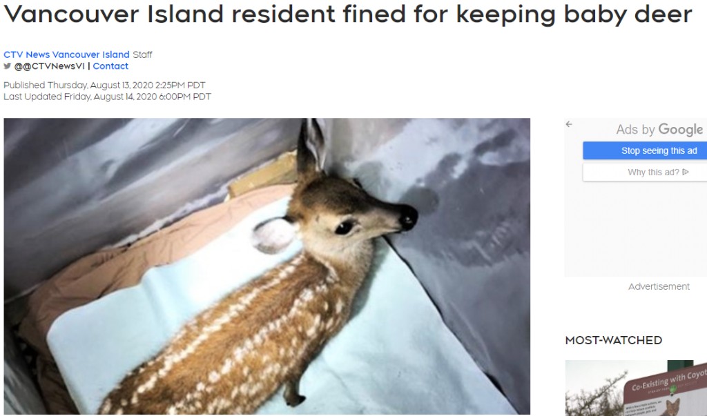 去年夏季溫哥華島上壹位男子就曾經試圖把壹只小鹿弄成自家寵物被野生動物保護機構發現,最終收到壹張$345的罰單。