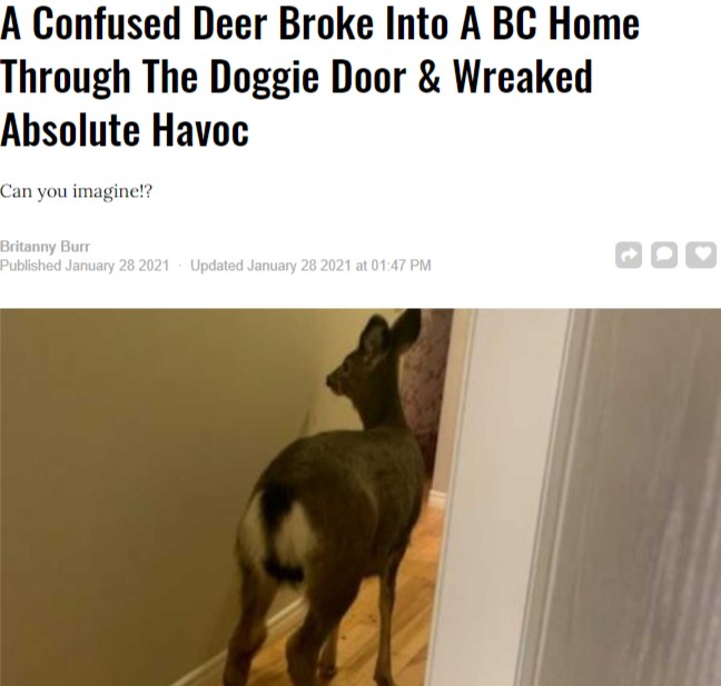 警方前往這戶人家調查發現,原來是這家人原本給毛孩子寵物狗留的自由進出的狗門裡,闖入了壹只小鹿。