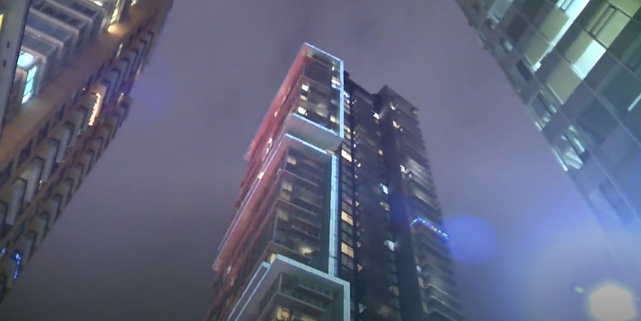 周日清晨,大量警察趕到溫市中心Richards St. 777號的Telus Gardens公寓,有幾個人被帶上手銬。