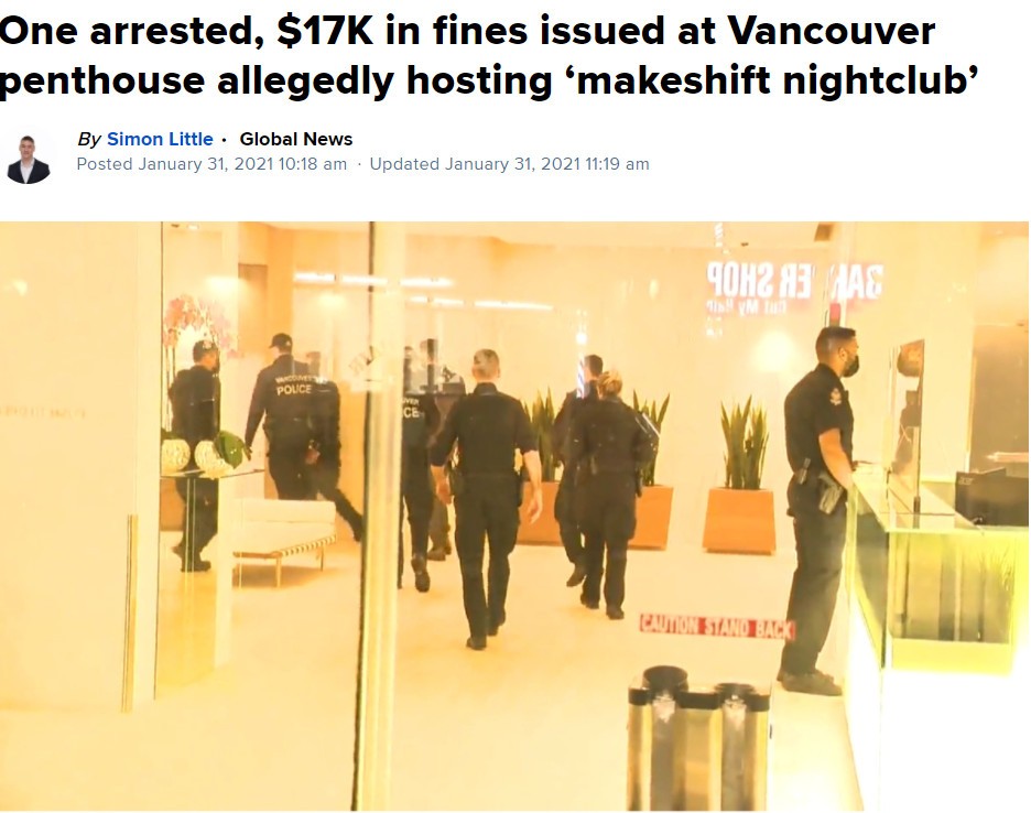 (加西網綜合)溫哥華警方周日上午在市中心頂層公寓,發現壹個臨時夜總會,78人聚集在壹起開派對,之後警方開出了17,000加元的天價罰單,其余77人每人罰款230元。